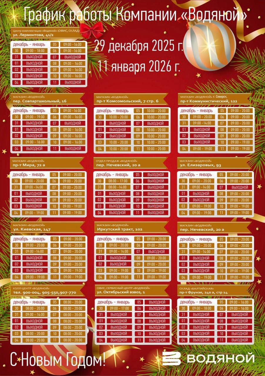 Дорогие клиенты! Спешим сообщить вам график работы наших магазинов и офисов на время новогодних праздников!