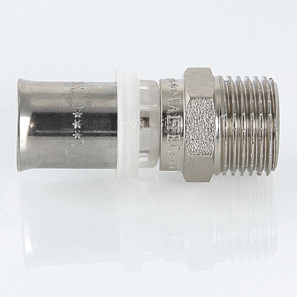 (VTm.201.N) Пресс-фитинг с переходом на наружную резьбу предназначен для соединения металлопластиковой или РЕХ-трубы с элементом системы, имеющим внутреннюю резьбу. Корпус фитинга – латунный никелированный. Материал пресс-гильзы – нержавеющая сталь AISI 304, уплотнений (два кольца на штуцере) – EPDM, фиксатора – нейлон. Резьба – наружная, соответствующая ГОСТу 6357 – имеет насечки для наилучшего удержания уплотнительного материала при монтаже. Особенностями пресс-фитингов VALTEC являются увеличенная пропускная способность, прочность и термостойкость. Конструкция обеспечивает надежное соединение. Для монтажа применяется пресс-инструмент с насадками типа «ТН».