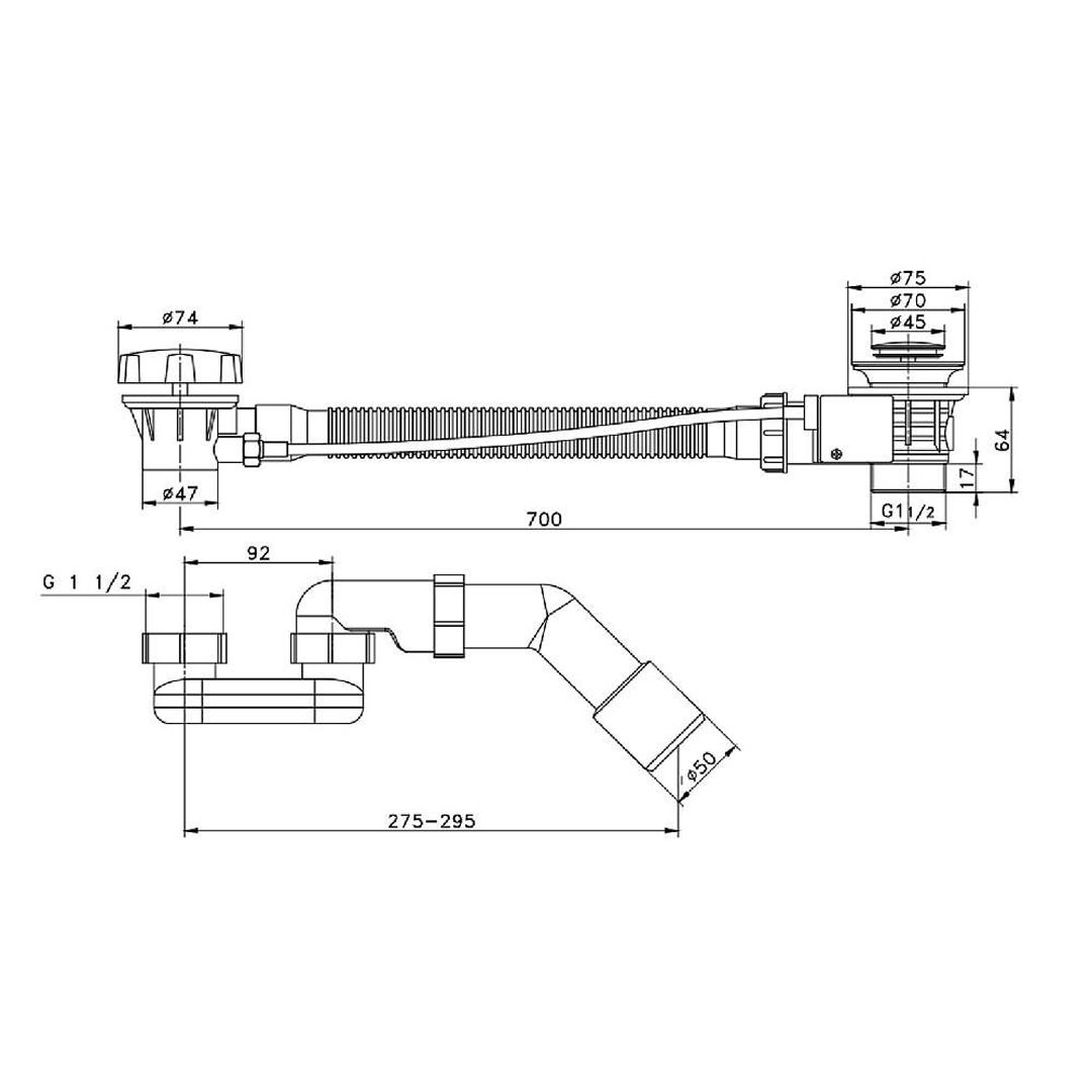 Сифон для ванны Сделан из высокопрочного пластика, который не боится экстремально высоких и низких температур, а также воздействия агрессивной бытовой химии. Подходит для большинства современных моделей ванн толщиной до 10 мм. Пробка слива и заглушка перелива хромированного цвета придадут вашей ванне элегантный и современный вид.