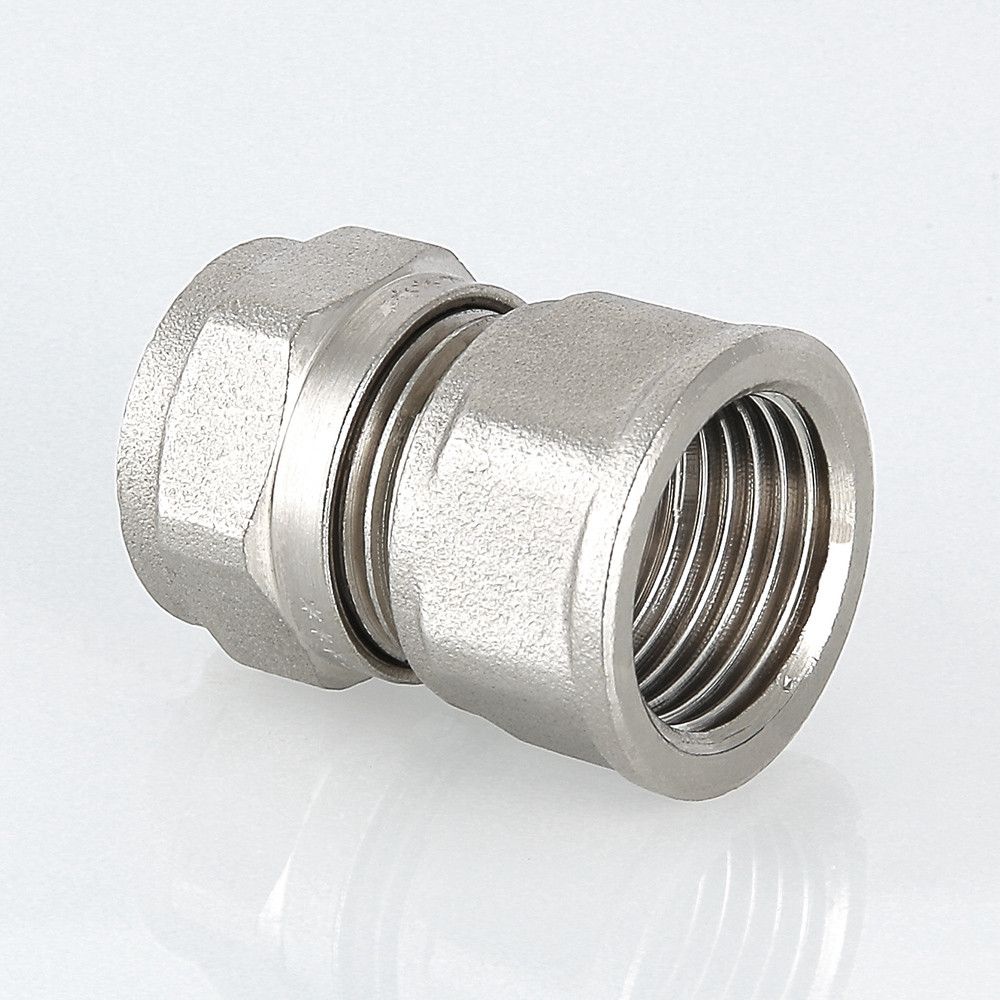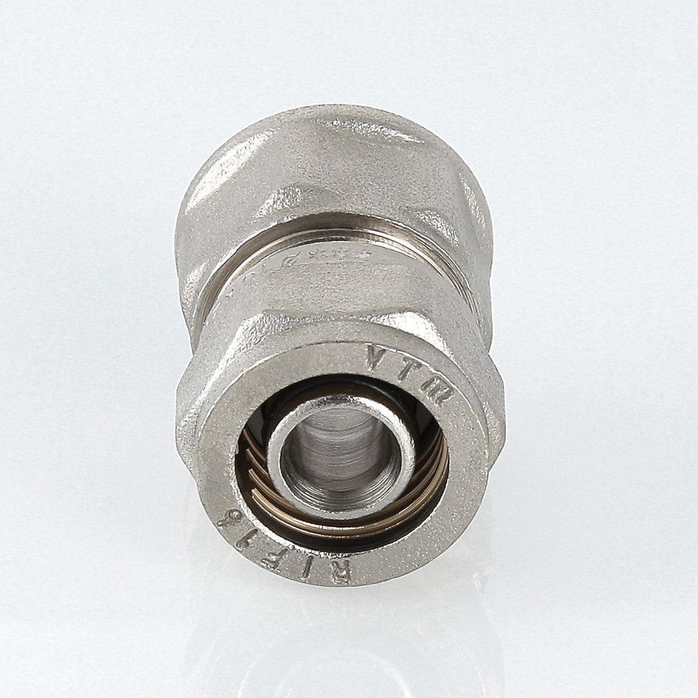 (VTm.302.N) Прямой латунный никелированный фитинг для соединения металлополимерной трубы и компонента системы с резьбовым подключением. Резьба фитинга – внутренняя трубная по ГОСТу 6357.